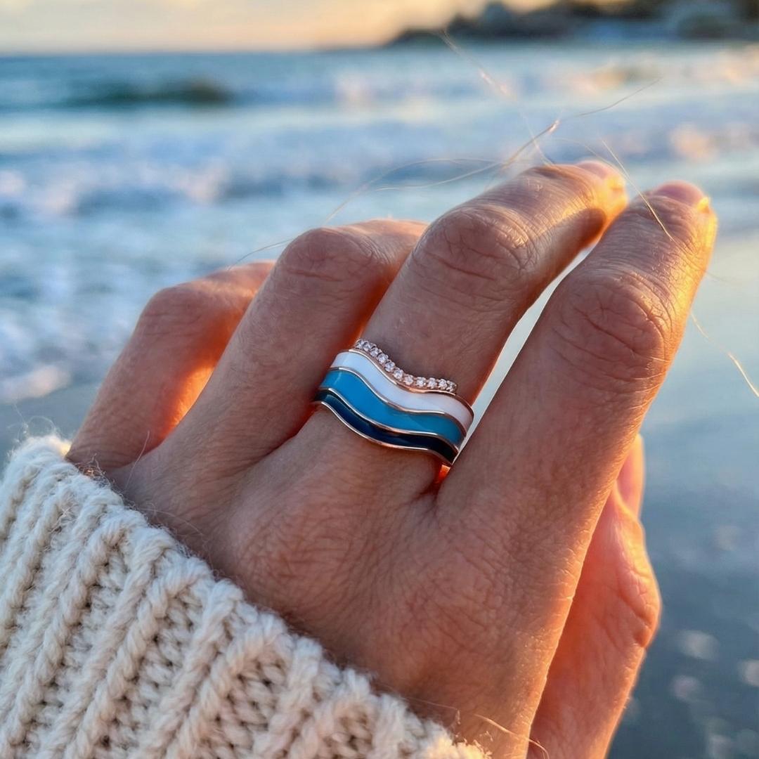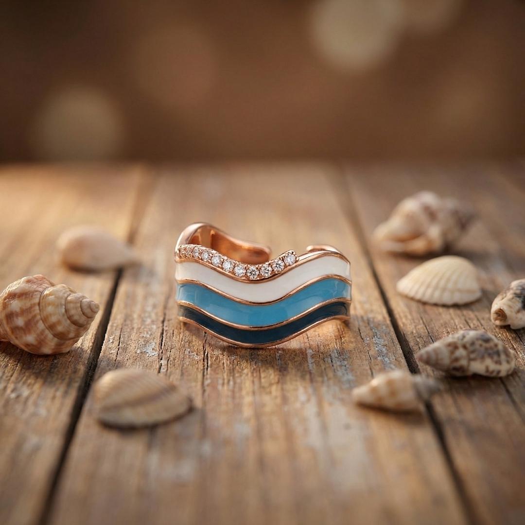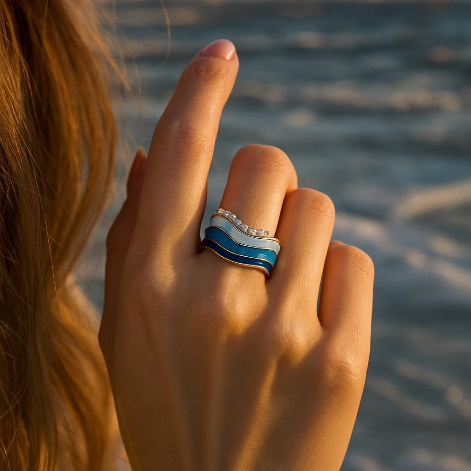 Profilo ondulato, linee pulite e luce dei quarzi: un anello dal carattere boho marittimo, moderno e femminile. La fascia mossa abbraccia il dito con un riflesso fresco, sobrio e luminoso.