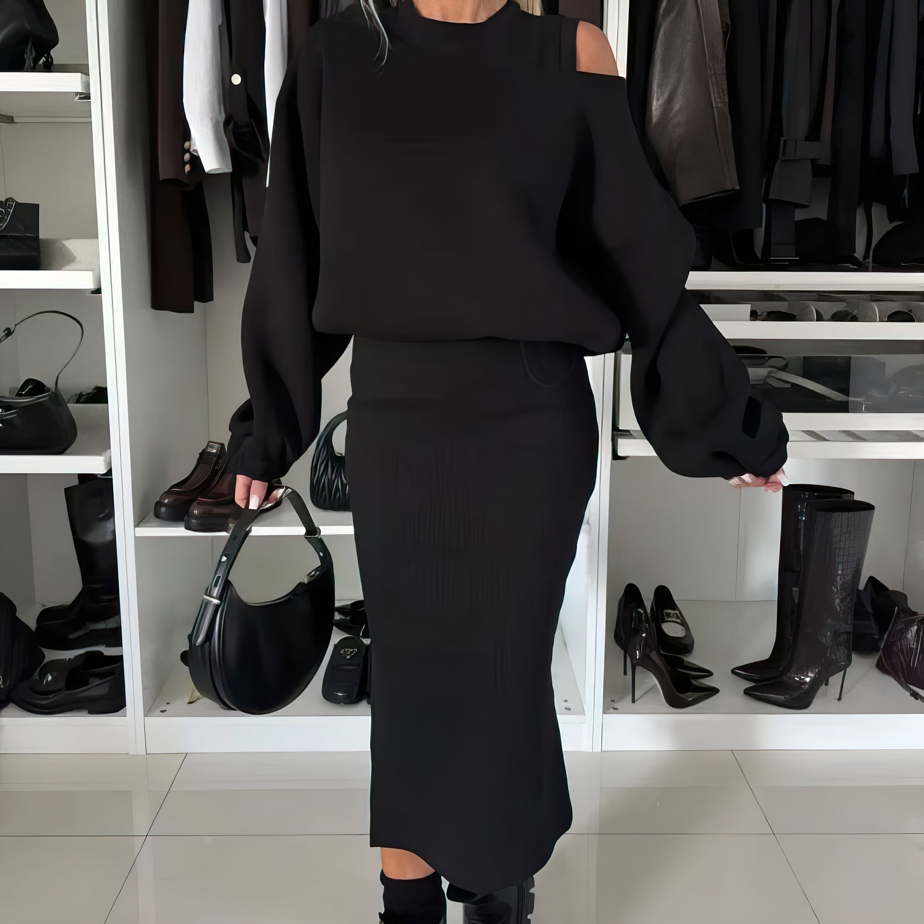 Amélie Luxe™ | Ensemble avec top off-shoulder et jupe midi