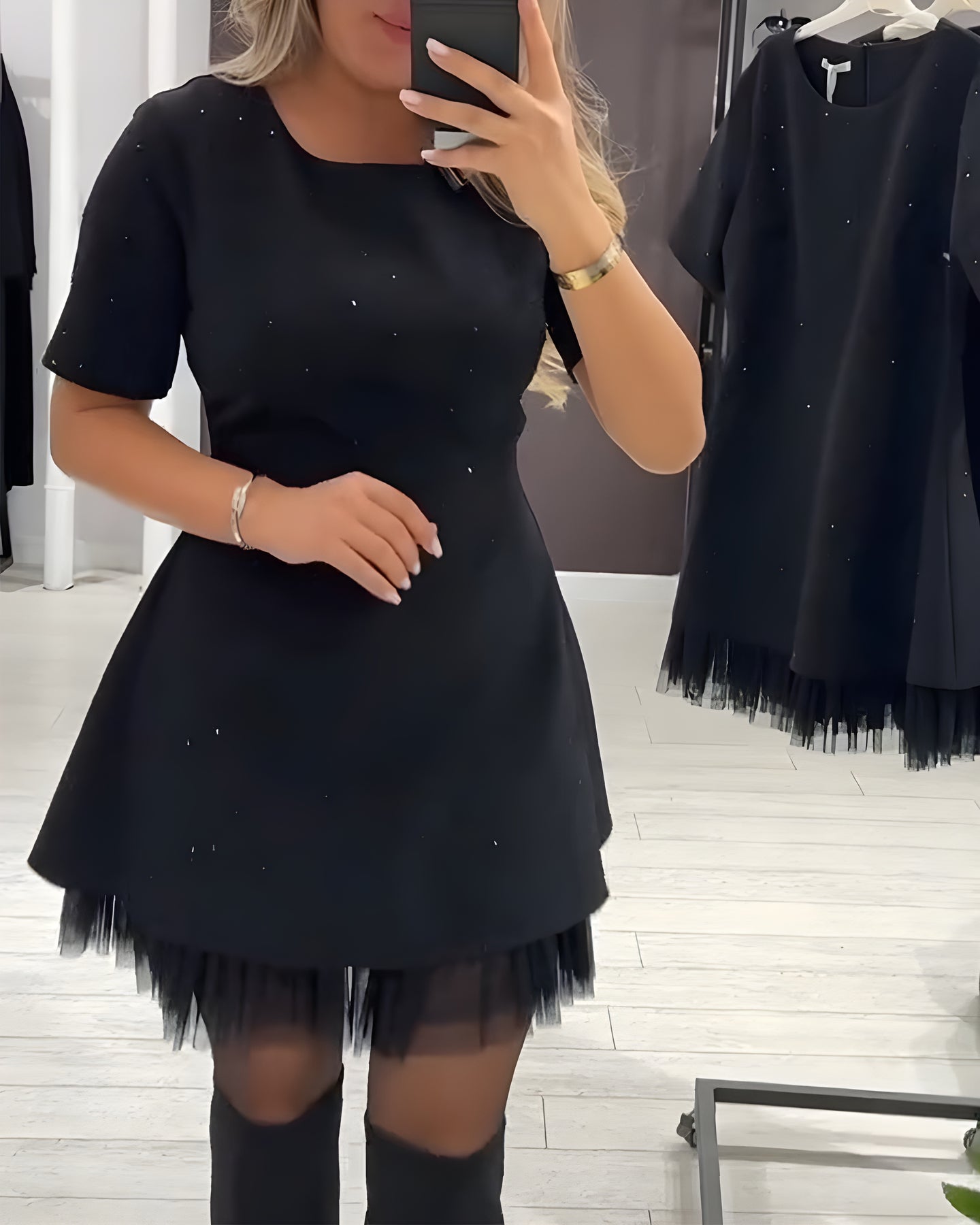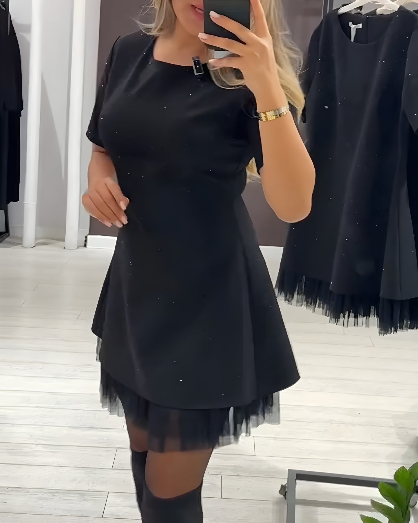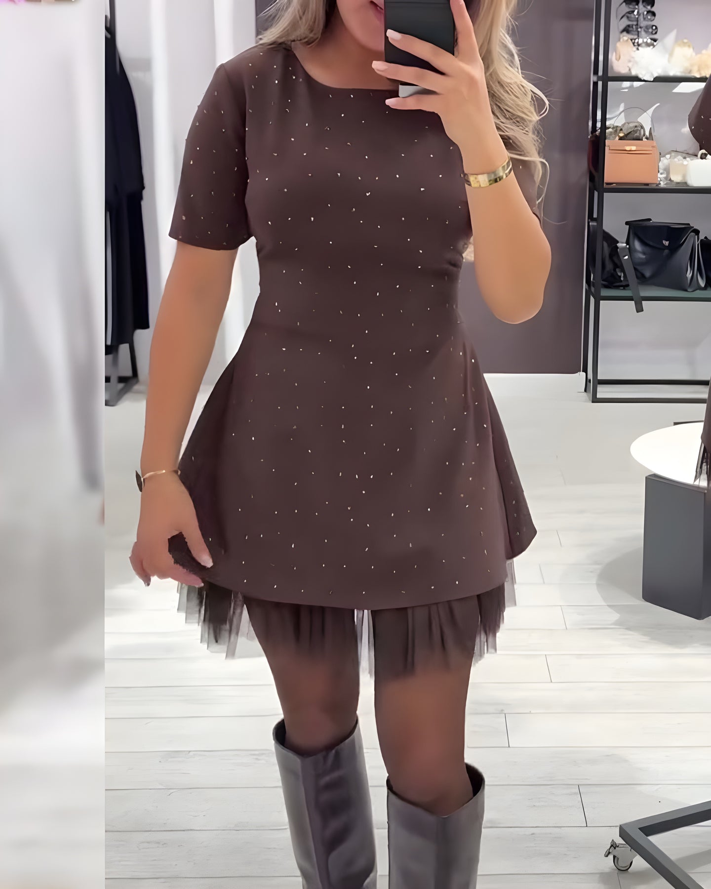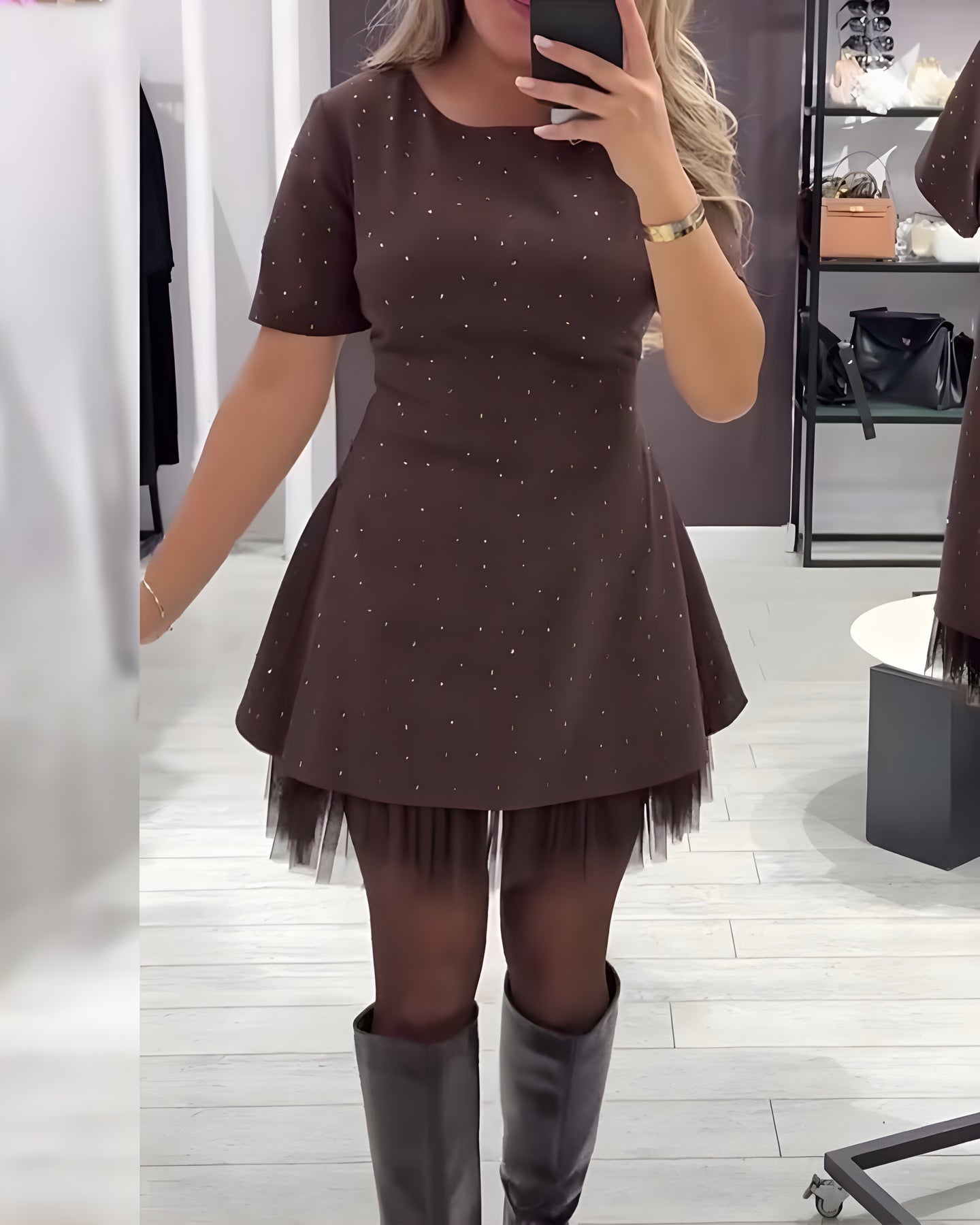 Andréa™ apporte un jeu de textures raffiné grâce à son motif patchwork en maille scintillante. La coupe fluide met la silhouette en valeur sans comprimer, parfaite pour soirées, dîners ou événements spéciaux.