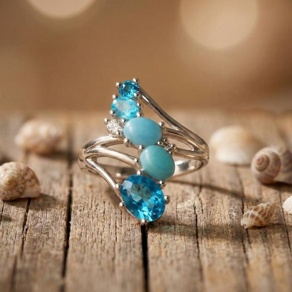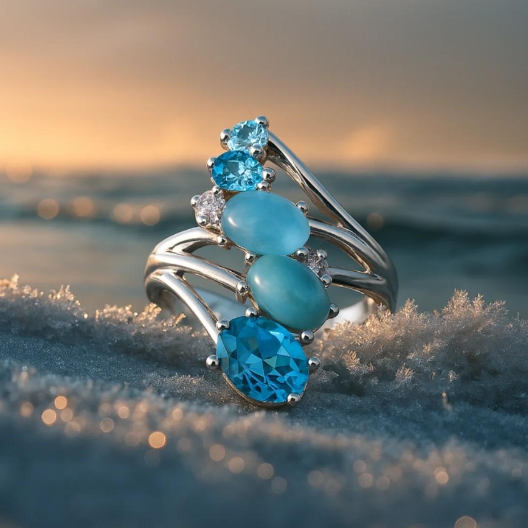 Un anello che racchiude la magia delle diverse sfumature del mare: dal turchese più delicato al blu profondo delle onde.