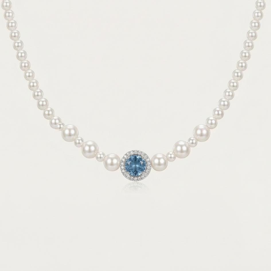 Elysea unisce il candore delle perle alla profondità di un’acquamarina color mare, al centro del girocollo. Una collana che sembra catturare il riflesso dell’onda al chiaro di luna, delicata ma capace di farsi notare in ogni occasione.