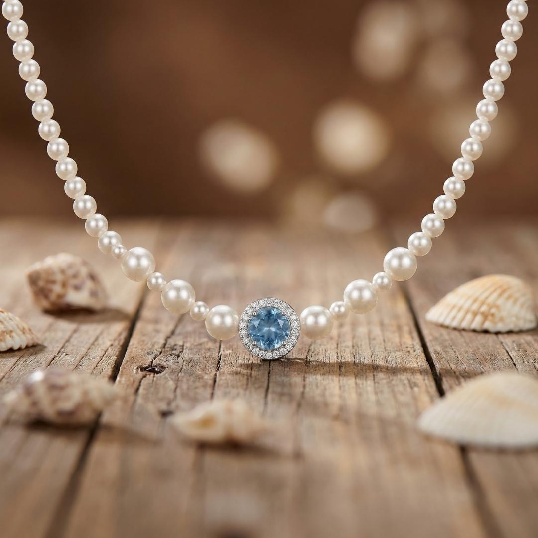 Realizzata con struttura argentata e con perle da laboratorio e acquamarina creata in laboratorio incastonata in un elegante punto luce centrale. Lunghezza di circa 40 cm, perfetta come girocollo luminoso da indossare da solo o in abbinamento ad altri gioielli I Segreti del Mare.